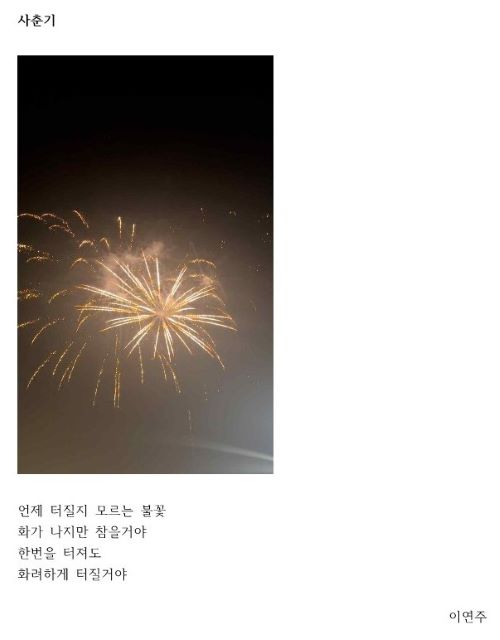이 작품은 쇠소깍 축제에서 불꽃놀이를 보고 영감을 얻은 디카시로 사춘기 시절의 방황하는 마음과 미래를 향한 강한 의지가 불꽃 사진과 시로 잘 어우러지게 표현돼 심사위원의 만장일치로 대상에 선정됐다.