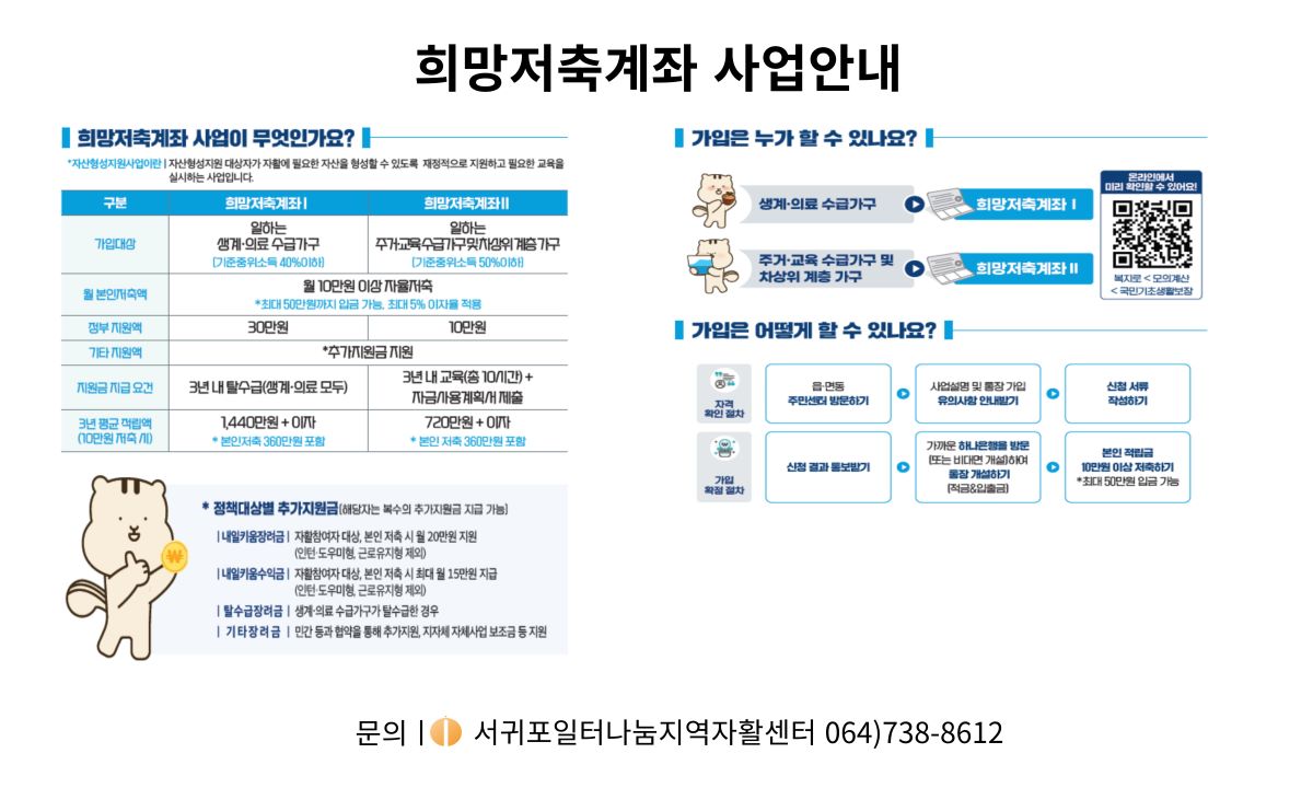 서귀포일터나눔지역자활센터(센터장 안정윤)는 24일 근로 사업소득이 있는 저소득층의 목돈마련과 자립 지원을 위한 ‘희망저축계좌Ⅰ·Ⅱ’ 사업에 대해 안내한다고 밝혔다.