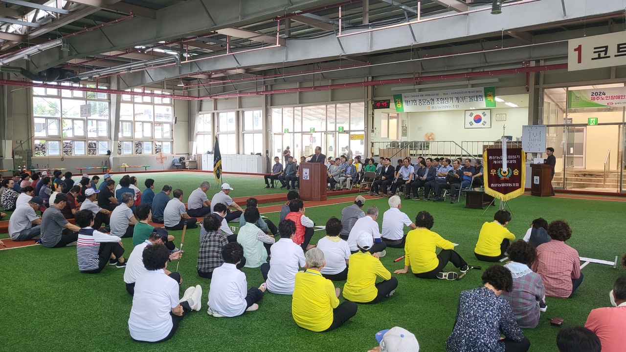 중문농협(조합장 김성범)은 지난 20일 서귀포시 전천후 게이트볼장에서 임정은 제주특별자치도의회 운영위원장, 강대규 농협서귀포시지부장, 게이트볼 선수단, 중문농협 임직원 등 200여 명이 참여한 가운데 제17회 중문농협 조합장기 게이트볼 대회를 성황리에 개최했다.