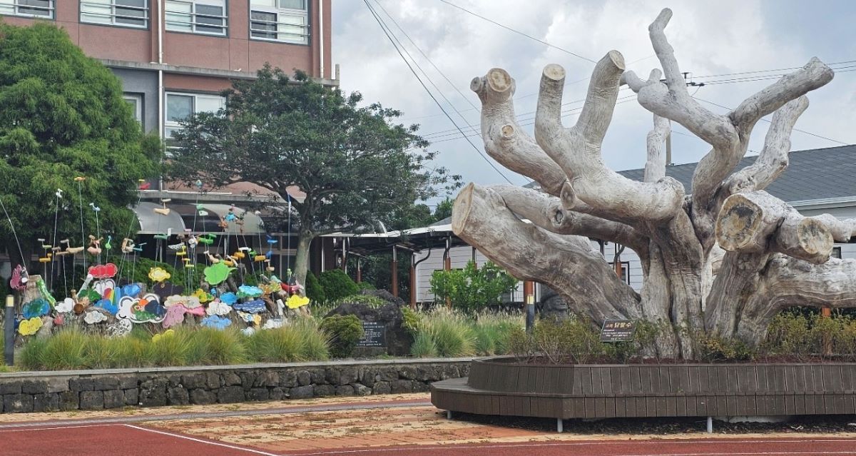 학생자치회가 기획한 담팔수 기억 공간은 담팔수의 형상 보존 및 일부 가지를 활용한 담팔수 솟대 제작으로 담팔수 주변 조형미를 살려 예술적 기억 공간으로 조성됐다.