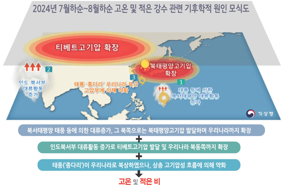 여름철 중후반인 7월 하순부터 8월 하순까지는 장기간 따뜻한 티베트고기압과 북태평양고기압이 우리나라 상공을 덮으면서 맑은 날이 많아 낮 동안 강한 햇볕으로 높은 기온이 지속됐고 비가 내리는 날이 적었다. 이로 인해 8월의 평균 기온은 평년보다 2.5도 높은 29.3도로 역대 1위를 기록했다. 8월 강수량은 평년(283.3㎜)의 27.6%인 78.2㎜로 역대 최저 1위를 기록했다.