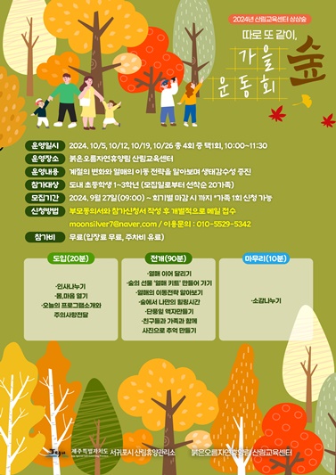 서귀포시 산림휴양관리소는 지역 초등학생 저학년을 대상으로 숲프로그램‘가을숲학교’를 오는 10월 15일부터 11월 5일까지 매주 토요일 오전 10시부터 12시까지 운영한다고 밝혔다.