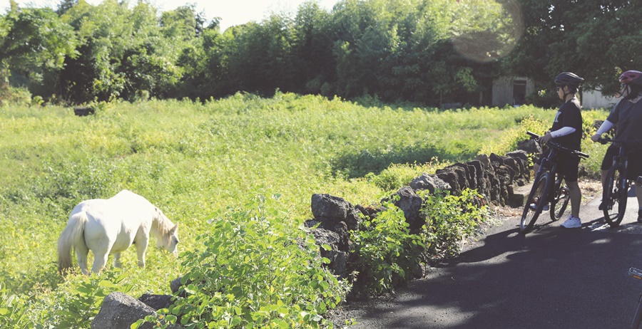서귀포시 법환동 마을회관 인근에 ‘행운이’라는 말이 살고 있다. 선선해진 10월의 첫 번째 주말, 자전거를 타던 가족이 행운이를 발견하자 잠시 멈추고는 즐거운 휴식시간을 보내고 있다.