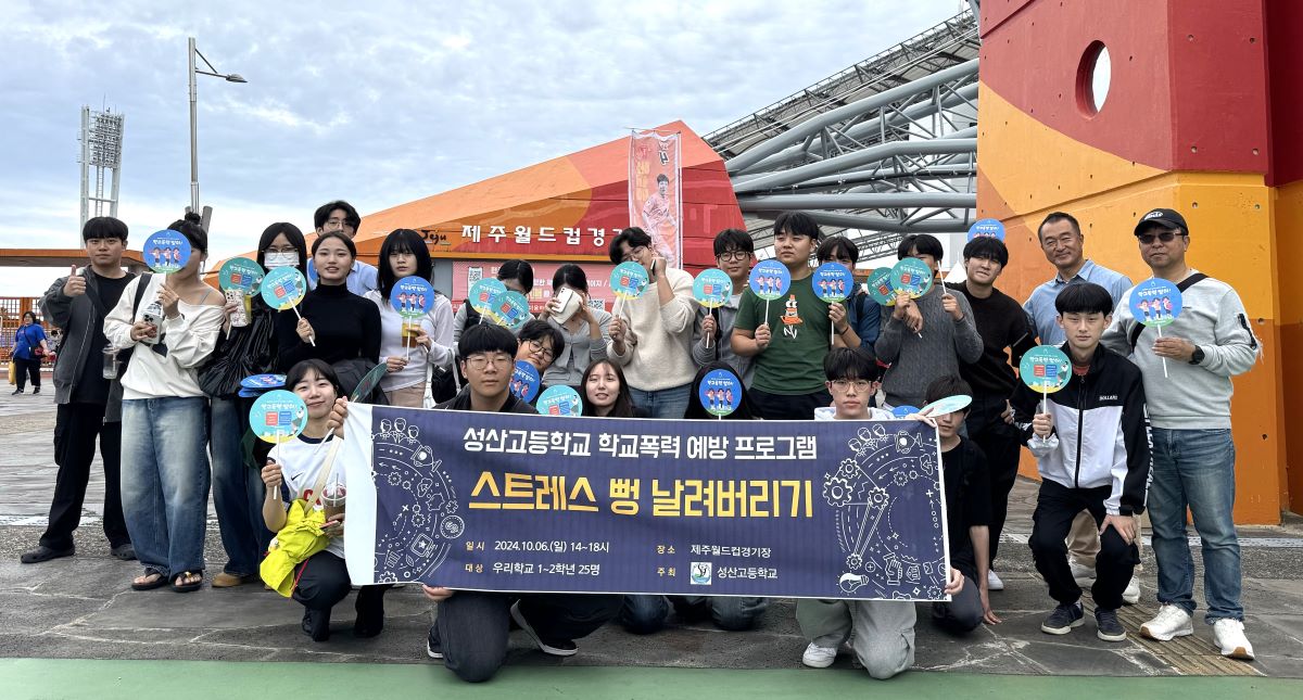 성산고등학교(교장 양기봉)는 지난 6일 1학년 및 2학년 학생 중 참가 희망 학생 25명과 교원 10명이 참여해 제주월드컵경기장에서 학교폭력 예방 프로그램 ‘스트레스 뻥 날려버리기’를 운영했다고 밝혔다.