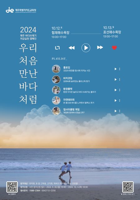 제주도교육청은 오는 12일 협재해수욕장과 13일 표선해수욕장에서 이틀에 걸쳐 2024년 제주바다쓰레기저감실천 캠페인 ‘우리 처음 만난 바다처럼’을 운영한다고 11일 밝혔다.