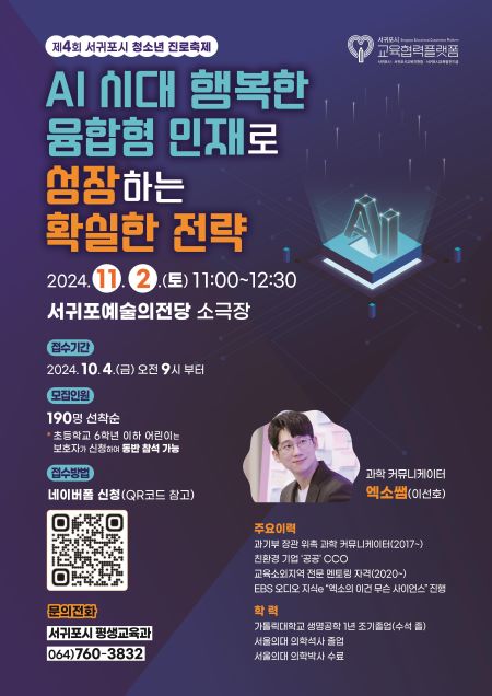 서귀포시는 다음 달 2일 오전 11시 서귀포예술의전당 소극장에서 제4회 서귀포시 청소년 진로 축제 프로그램으로 진로 특강을 개최한다고 밝혔다.