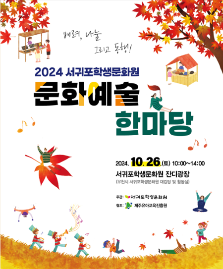 서귀포학생문화원(원장 강정림)은 오는 26일 ‘2024 서귀포학생문화원 문화예술 한마당’을 서귀포학생문화원 잔디광장에서 운영한다고 18일 밝혔다.