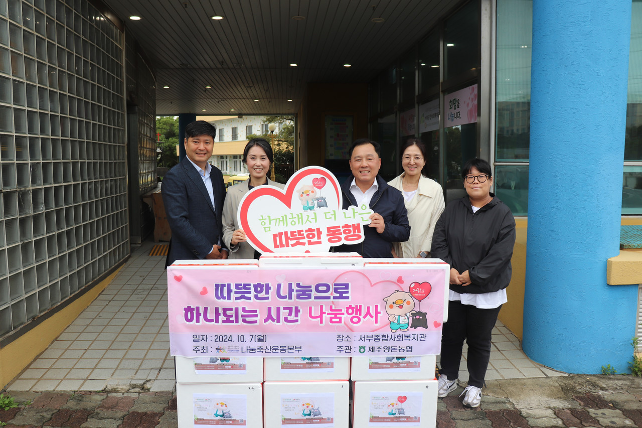 제주양돈농협(조합장 고권진)은 7일 서부종합사회복지관(관장 문은정)을 찾아 ‘따뜻한 나눔으로 하나 되는 시간’제주산 돼지고기 ‘제주도니’나눔 행사를 개최했다.