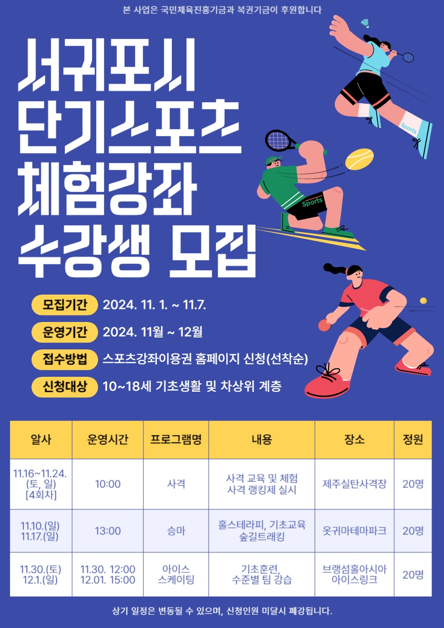 서귀포시는 오는 11월 10일부터 12월까지 저소득층 유‧청소년을 대상으로 사격, 승마, 아이스스케이팅 등 이색 스포츠를 체험할 수 있는 '단기 스포츠 체험강좌'를 운영한다고 밝혔다.