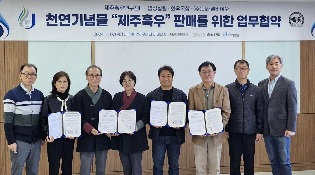 제주흑우연구센터(센터장 박세필)는 지난 7일 생활협동조합인 농업회사법인밥상살림(주)(대표 조상호)과 제주흑우 생산 농가인 와우목장(대표 민미연·이창종) 및 ㈜미래셀바이오(대표 김은영)와 제주흑우연구센터에서 제주흑우 판매 및 홍보를 위한 업무협약을 체결했다고 밝혔다.