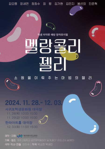 마약류 예방 학생 창작뮤지컬 멜랑꼴리 젤리(Melancholy Jelly)는 오는 28일과 29일 서귀포학생문화원 대극장에서 총 4회 공연으로 펼쳐지며, 제주한라대학교 한라아트홀에서는 다음 달 3일 2회 공연이 진행된다.