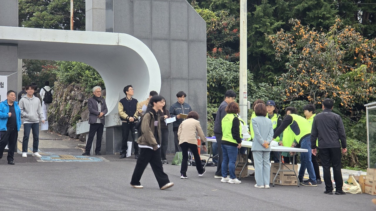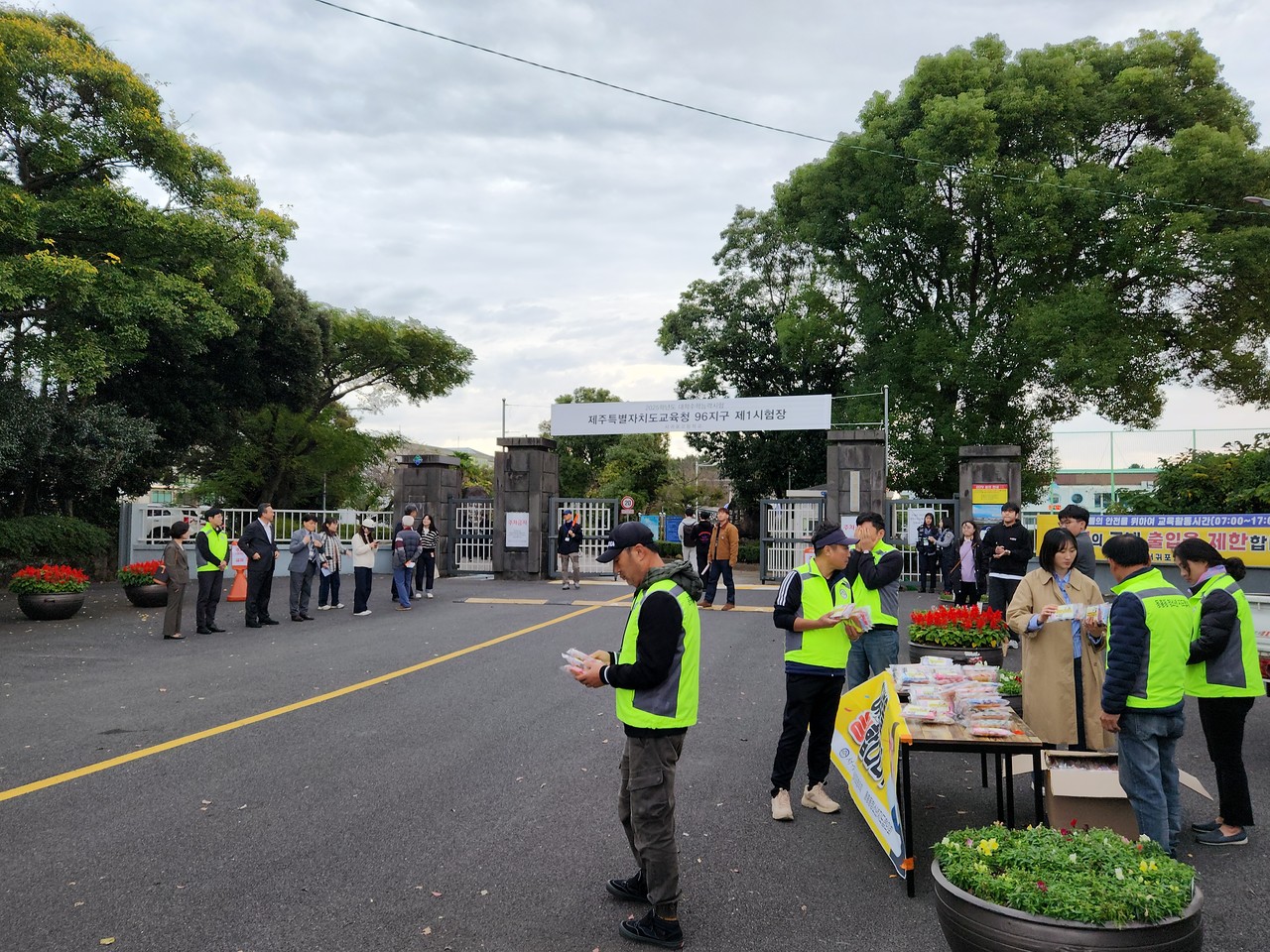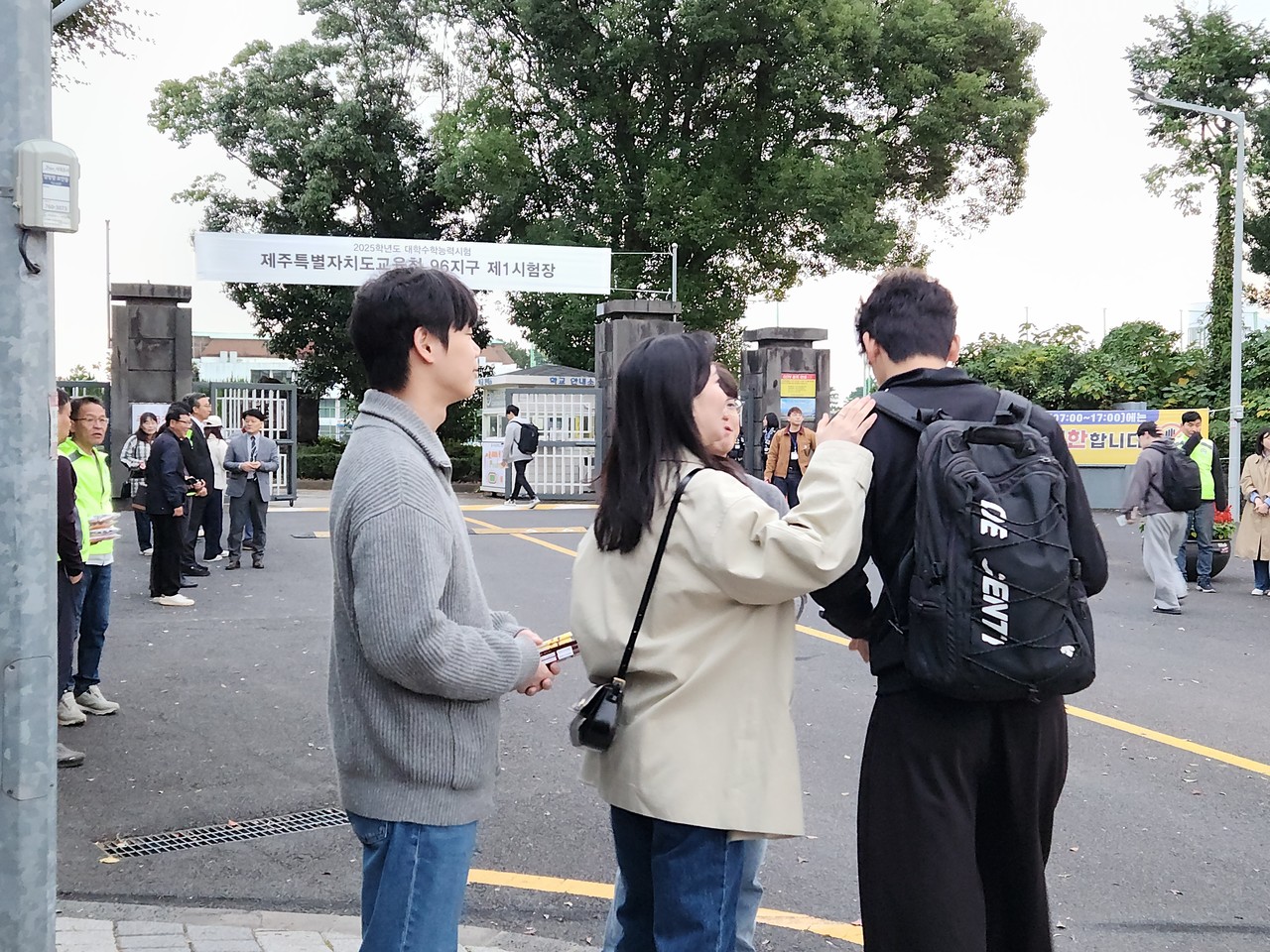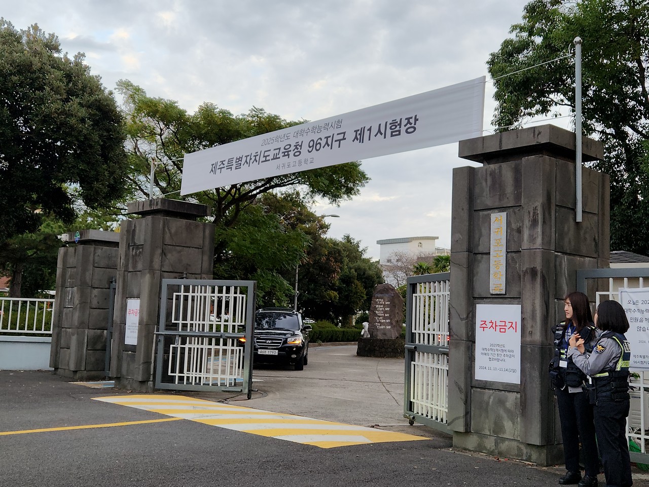 서귀포 지역 시험장 주변에는 모범운전자회 회원과 자치경찰 등이 교통관리에 나섰고, 지역 청소년협의회 등과 교사 등이 시험장 입구에서 수험생을 격려하며 응원했다.