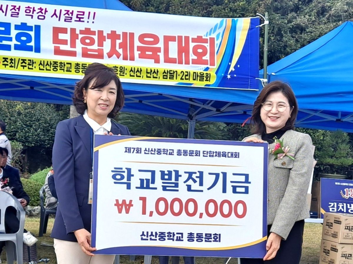 신산중학교(교장 박진자)는 지난 9일 운동장에서 제7회 신산중학교 총동문회 단합 체육대회를 개최하고 총동문회(회장 강명순)로부터 학교발전기금 100만원을 전달받았다고 밝혔다.