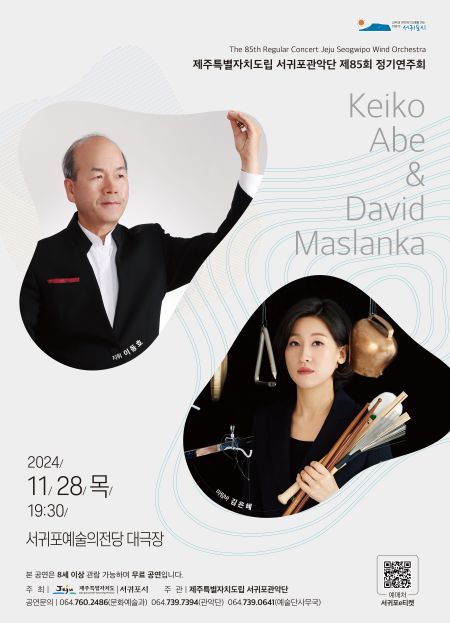 서귀포시는 오는 28일 오후 7시 30분 서귀포예술의전당 대극장에서 이동호 상임지휘자가 이끄는 제주특별자치도립 서귀포관악단의 제85회 정기연주회 ‘게이코 아베 & 데이비드 마슬란카’ 공연을 개최한다고 15일 밝혔다.