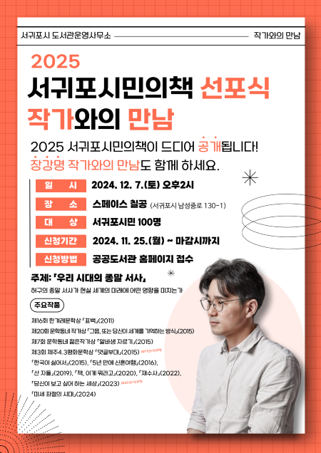 서귀포시 도서관운영사무소 관계자는 “서귀포시민의책을 통해 더 많은 시민이 독서의 기쁨을 느끼고 지역사회의 소통과 화합에 이바지할 수 있길 바란다”며 “책을 사랑하는 시민들의 많은 관심과 참여를 부탁드린다”고 전했다.