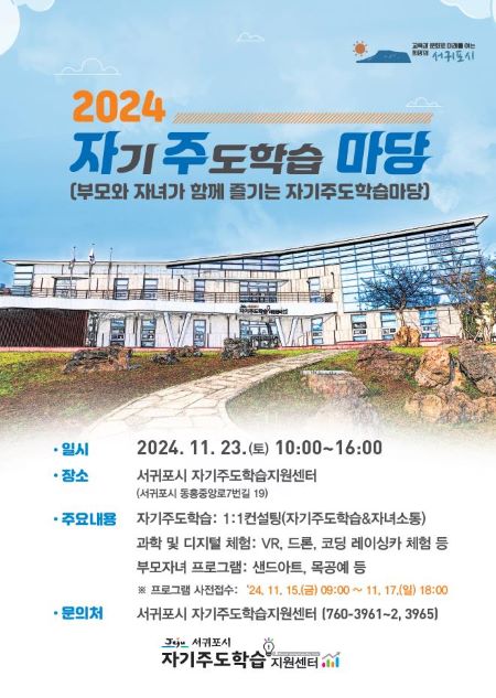 서귀포시는 관내 학생 및 학부모를 대상으로 오는 23일 서귀포시 자기주도학습지원센터에서 ’2024 자기주도학습 마당(자주마당)‘을 개최한다고 20일 밝혔다.