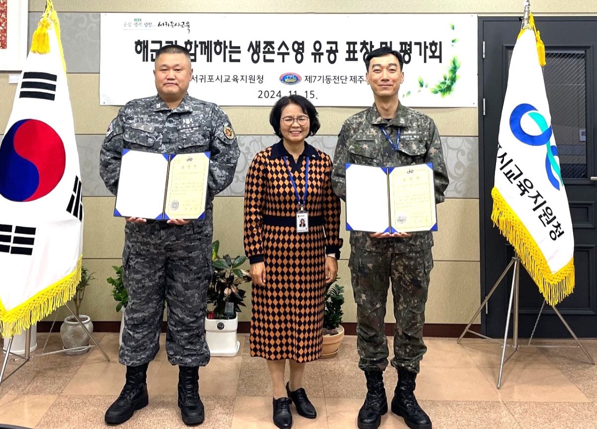 또한, 성공적인 생존수영 교육을 위해 함께 노력한 해군 관계자 2명에게 제주특별자치도교육감 표창장을 전달했다.