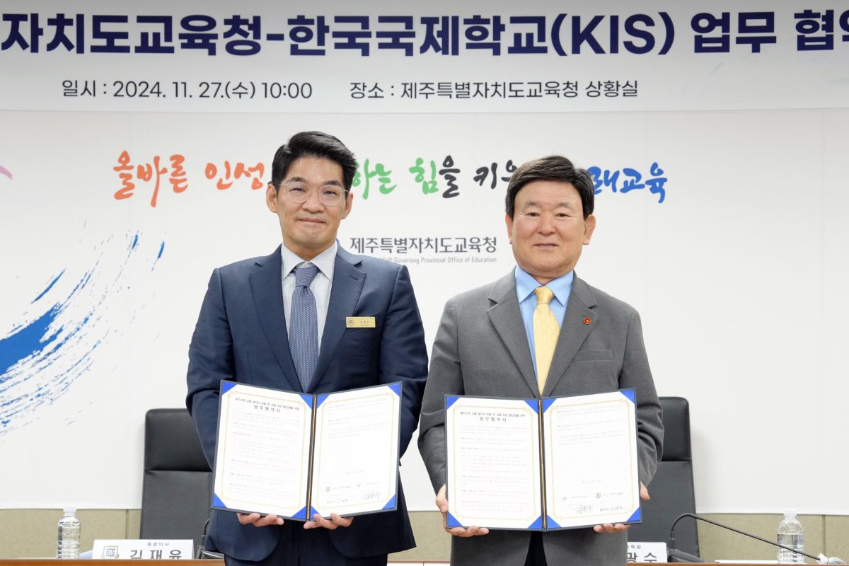 제주특별자치도교육청(교육감 김광수)과 한국국제학교(KIS,대표이사 권오찬)는 27일 도교육청 상황실에서 제주 지역 고졸 일자리 창출 및 취업 활성화를 위한 업무협약을 체결한다고 밝혔다.