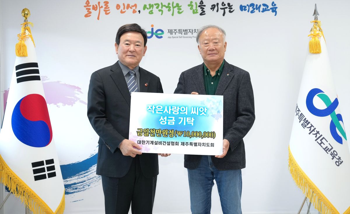 제주특별자치도교육청은 지난 2일 현동수 대한기계설비건설협회 제주특별자치도회장이 도교육청을 방문해 ‘작은 사랑의 씨앗’ 성금 1000만원을 기탁했다고 밝혔다.