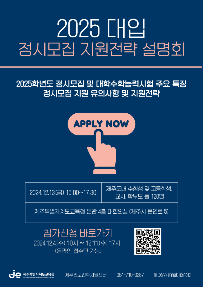 설명회 참석을 희망하는 학생, 교사, 보호자는 오는 11일 오후 5시까지 제주진로진학지원센터 누리집(https://jinhak.jje.go.kr/)을 통해 신청할 수 있다.