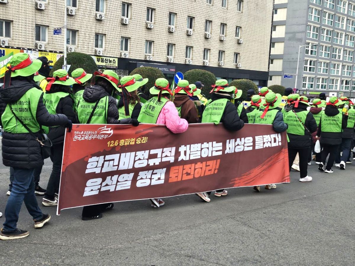 이어 “교육공무직의 차별 해소와 직무 가치 인정을 위한 책임 있는 안을 내놓으라고 요구하자, 교육부는 노동조합 대표자를 체포하는 것으로 답을 대신했다. 교육공무직 노동자들이 결기를 모아 파업 전선에 나서자, 윤석열 정부는 반헌법적인 계엄령을 통해 노동자의 파업 투쟁을 저지하려 시도하는 것으로 응답했다”고 피력했다.