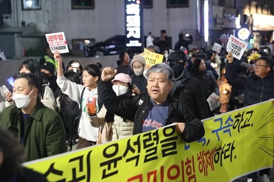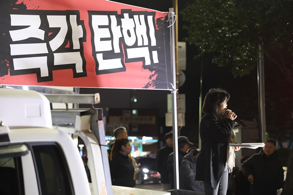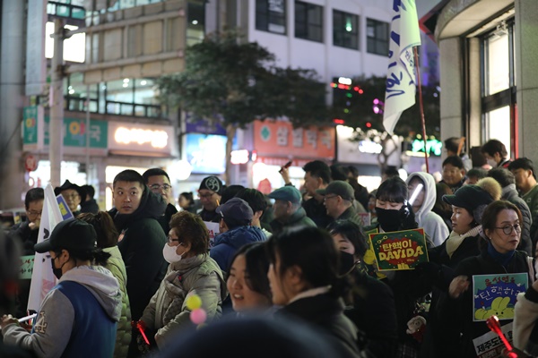 11일 오후 6시 30분 서귀포시 중앙로 국민은행 사거리에서 500여 명으로 추산되는 서귀포 시민이 모인 가운데 윤석열 대통령 탄핵 집회가 열렸다.