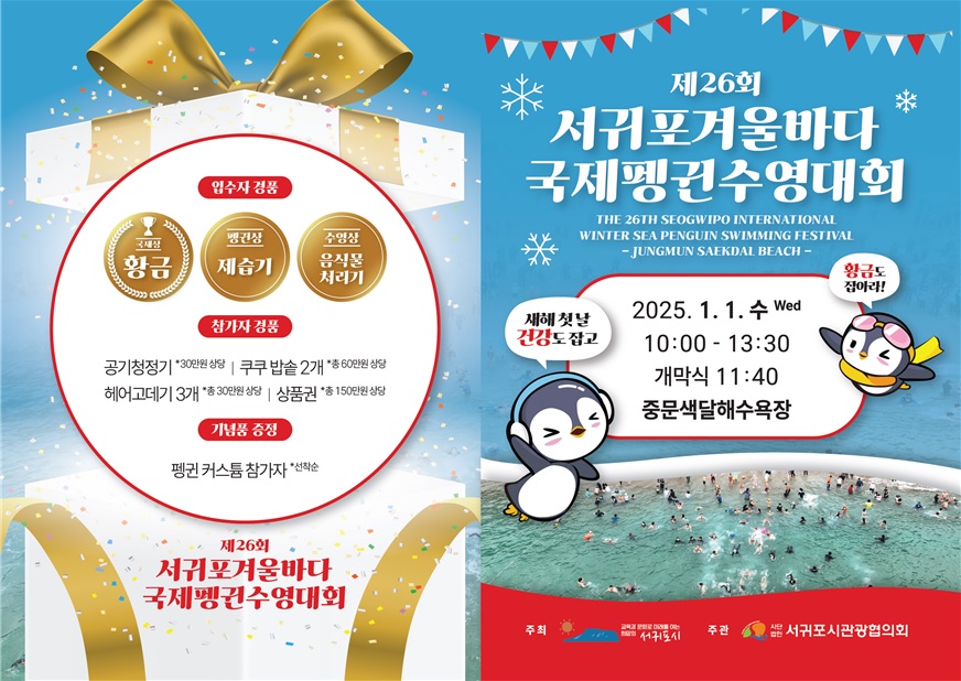 고상희 관광진흥과장은 "서귀포 겨울바다 국제 펭귄수영대회는 단순히 차가운 바다에 뛰어드는 행사가 아니라, 새해를 맞아 도전과 용기를 다짐하고 건강을 기원하는 특별한 이벤트"라며 "을사년 푸른뱀의 해를 맞아 재생과 희망의 상징을 더해, 참가자들에게 더욱 의미 있는 시간이 되길 바란다"고 말했다.