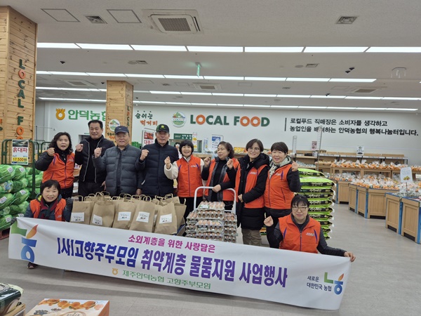 제주안덕농협(조합장 이한열) 고향주부모임(회장 윤은숙)은 지난 22일 연말연시를 맞아 취약계층 30가구를 찾아 200만원 상당의 물품을 지원했다.