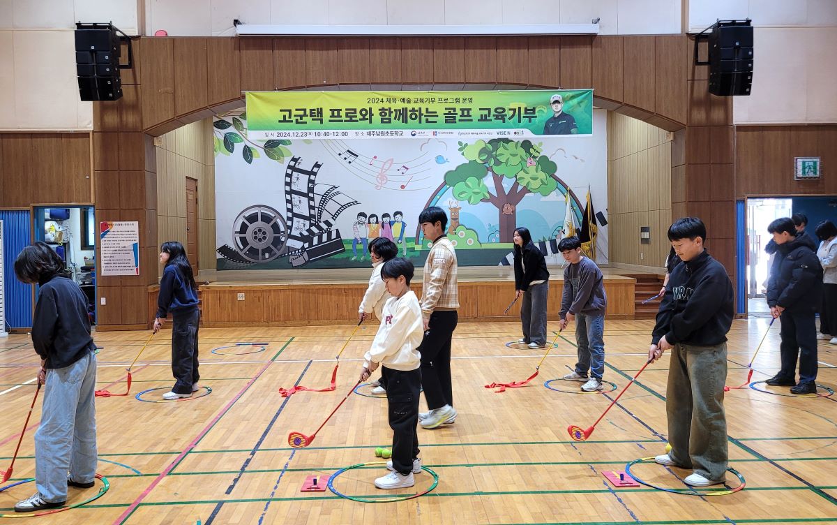 체육예술교육기부 거점 대학인 제주대학교와 연계해 고군택 골프 프로는 6학년 학생들을 대상으로 스내그 골프 재능 기부를 했다. 학생들의 골프 스윙 자세를 직접 교정해 주고, 격려의 말을 통해 학생들에게 큰 영감과 도전 정신을 전했다.