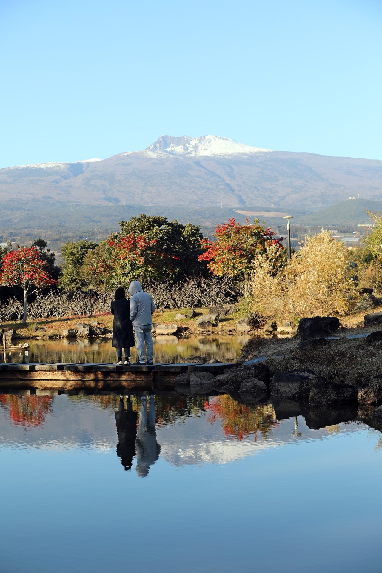 칠십리시공원은 붉은 열매가 달린 먼나무와 눈 덮힌 한라산이 어우러지며 이색적인 풍광을 연출하고 있다. 칠십리시공원 연못에 비친 한라산과 시민의 모습이 정겹다.