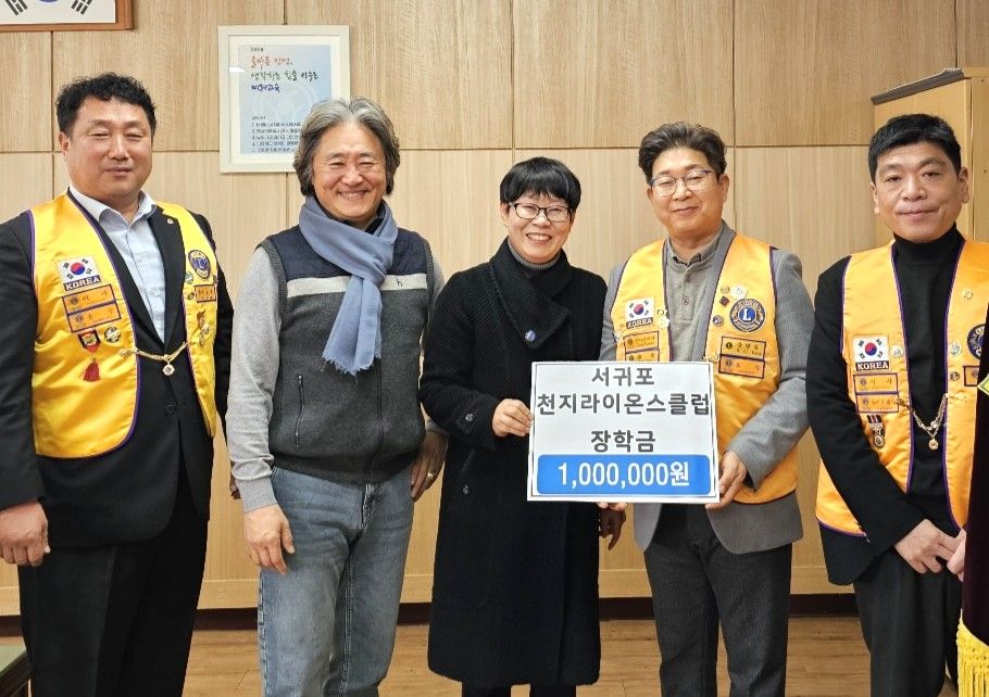 서귀포여자고등학교(교장 양순우)는 지난 8일 서귀포 천지라이온스클럽(회장 강병철)이 학교를 방문해 장학금 100만원을 전달했다고 밝혔다.