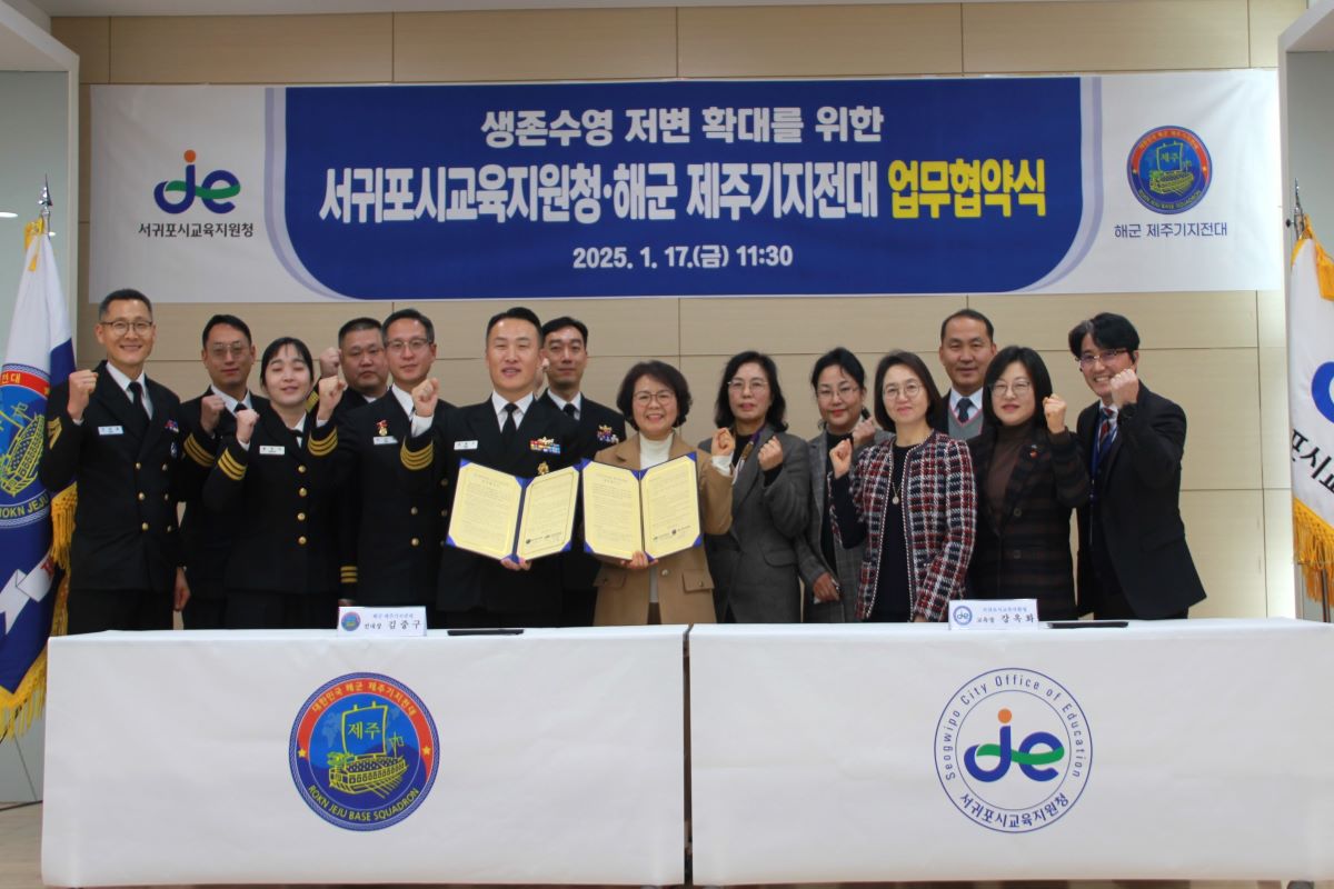 서귀포시교육지원청은 대한민국 해군 제주기지전대(전대장 김중구)와 17일 해군 김영관센터에서 전문적인 생존수영 교육 프로그램 저변 확대를 위한 업무협약식을 가졌다.