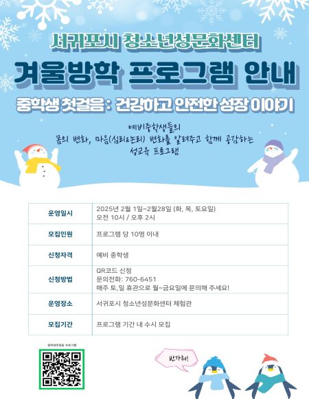 서귀포시 청소년성문화센터에서는 2월 한 달 동안 예비 중학생을 대상으로 성교육 프로그램 ‘중학생 첫걸음: 건강하고 안전한 성장 이야기’ 운영에 들어간다.