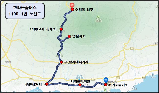 서귀포 출발 한라눈꽃버스의 노선은 서귀포등기소를 출발해 서귀포터미널▶중문사거리▶구)탐라대사거리▶영실지소▶1100고지 휴게소▶어리목 입구를 경유한다.