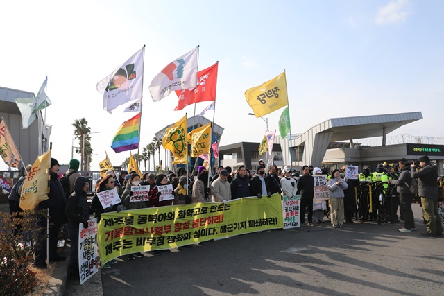 오영훈 제주도지사는 "2024년 강정항을 통해 50만명의 외국인 관광객이 제주를 방문했다"며 "안보와 경제는 협력 관계 속에서 동시에 성장할 수 있다는 것을 보여줬다"고 말했다.