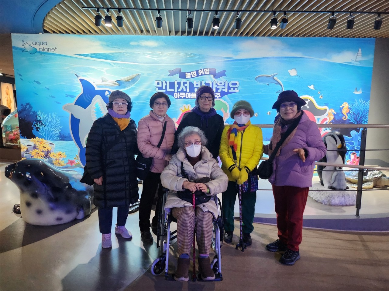 동백이 한창인 위미 동백수목원에서는 붉은 꽃망울을 배경으로 기념사진을 찍었고, 아쿠아플라넷에서는 제자들이 번갈아 휠체어를 밀며 김 선생님의 발이 되어주었다.