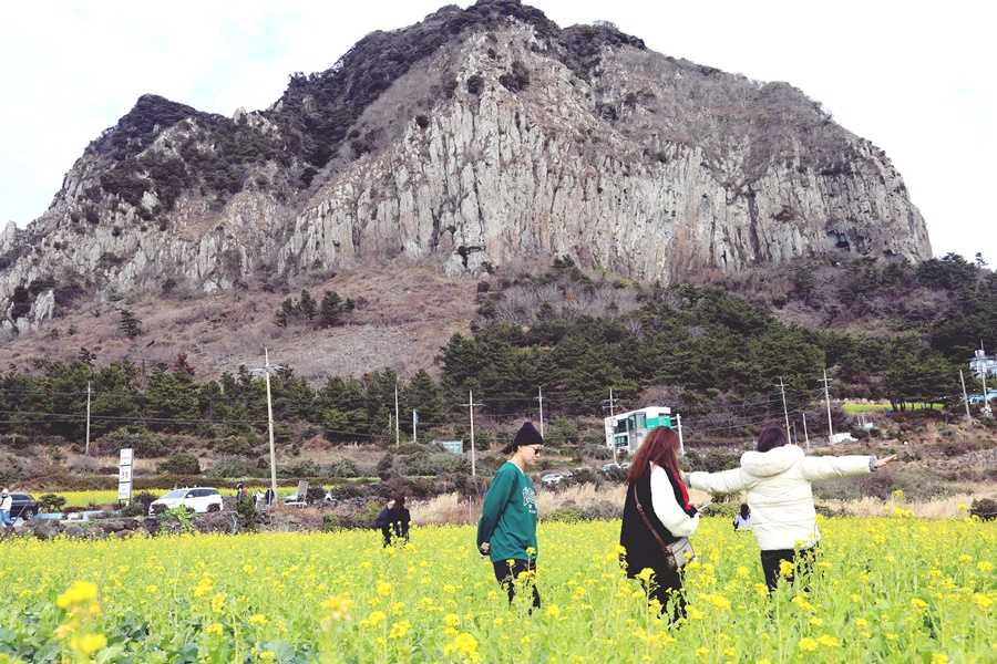 절기상 봄을 맞은 서귀포 지역은 봄을 시샘하는 추위가 남았다. 봄의 전령사로 불리는 유채꽃이 서귀포의 봄을 맞는다. 산방산을 배경으로 유채꽃 밭에서 도민과 관광객이 추억을 남기고 있다