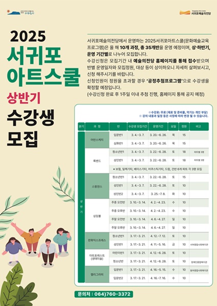 상반기 프로그램 참여 신청은 3월 4일부터 서귀포예술의전당 홈페이지를 통해 가능하며, 수강생은 공개 추첨으로 선정된다. 자세한 사항은 서귀포예술의전당(064-760-3372)으로 문의하면 된다.