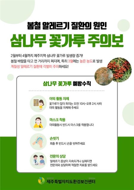 제주특별자치도 환경보건센터는 지난 21일 봄철 알레르기로 삼나무 꽃가루에 대한 주의를 당부했다.