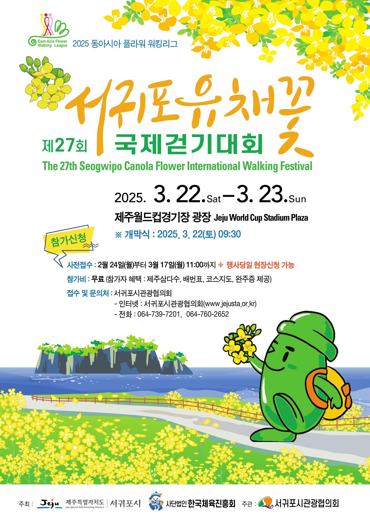 서귀포시와 한국체육진흥회가 공동 주최하고, (사)서귀포시관광협의회(회장 한희섭)가 주관하는 제27회 서귀포 유채꽃 국제걷기대회가 오는 3월 22일부터 23일까지 제주월드컵경기장을 주 행사장으로 서귀포시 일원에서 열린다.
