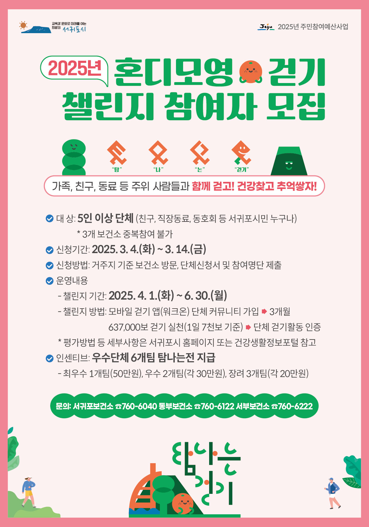 서귀포시는 시민의 건강한 생활과 함께 걷는 문화를 확산하기 위해 '2025년 혼디모영 걷기 챌린지' 참여자를 모집한다.