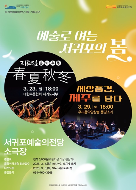 서귀포예술의전당은 봄을 맞아 제주의 자연과 삶을 담은 한국무용과 국악 공연을 선보인다. 서귀포 지역 예술인들의 자긍심을 높이고 창작 지원에 초점을 맞춘 이번 무대는 23일과 29일 두 차례에 걸쳐 진행된다.