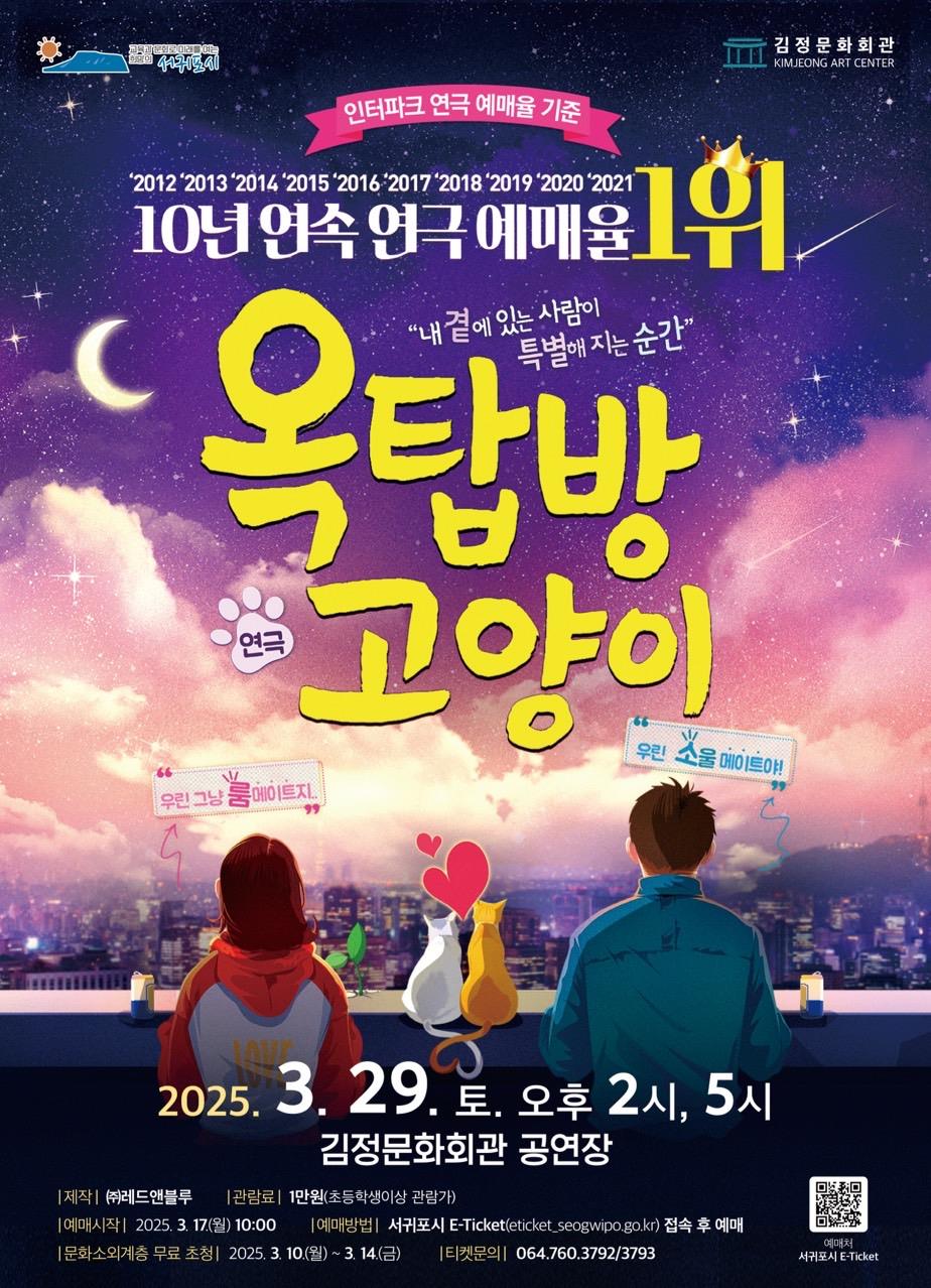 서귀포시 김정문화회관이 연극 장르의 접근성을 확대하고 시민들에게 다채로운 문화적 경험을 제공하기 위해 진행하는 연극 특성화 사업 '연극이 있는 날'의 두 번째 공연으로 대학로 최고의 인기 연극 '옥탑방 고양이'를 선보인다.