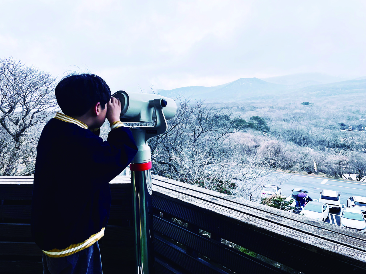 개구리가 잠에서 깬다는 경칩(3월 5일)도 지나 완연한 봄 기운이 서귀포를 감싸고 있다. 봄의 초입에서 물러나는 겨울 풍경을 담기 위해 어린이가 망원경으로 눈 덮힌 한라산을 바라보고 있다.