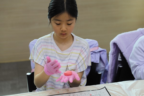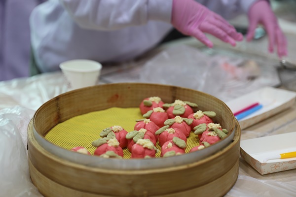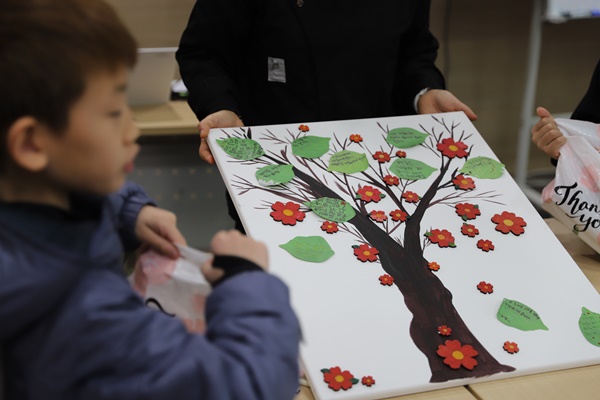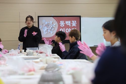 송편 만들기 실습에서 아이들은 붉은 ‘홍국쌀’을 낸 반죽으로 동백꽃을, 녹차가루를 섞은 초록색 반죽으로 푸른 동백잎을 표현했다. 특히 제주 전통 식문화를 반영해 완두콩을 소로 사용한 점이 돋보였다.