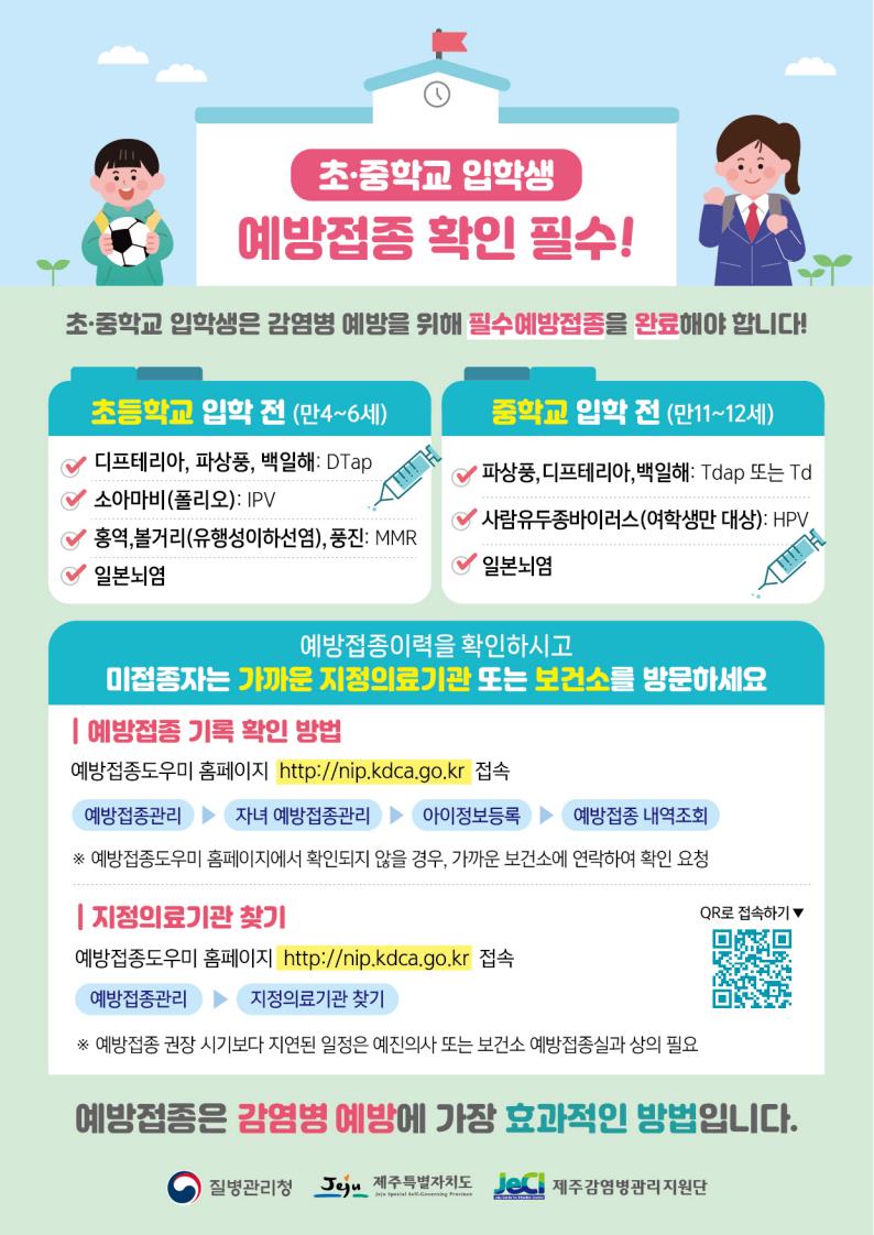 서귀포시 서부보건소가 올해 초등학교 및 중학교 입학생들의 감염병 확산을 예방하고 학생들의 건강 보호를 위해 필수예방접종 완료를 당부했다.