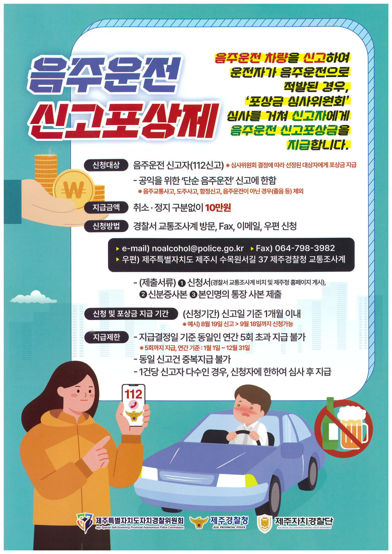 자치경찰위원회는 제주경찰청·자치경찰단과 협력해 신고자에게 음주운전신고포상금 신청 절차를 적극적으로 안내하고 각 관서 내 전광판 홍보 문구 현출 및 읍·면·동사무소, 각 경찰서·지구대·파출소, 공·항만, 다중인구밀집구역 등에 홍보 포스터·안내전단지 비치 등 홍보를 확대할 예정이다.