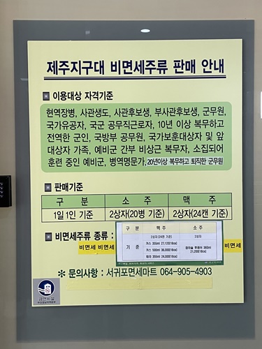 최근 해군강정기지 김영관 센터 내 ‘면세주류마트’를 방문했다. 서귀포시 지역의 유일한 군마트인 이곳에서는 주류만 판매하고 있어 국가유공자와 보훈대상자들의 실질적인 복지 혜택이 제한되고 있다는 지적이 나오고 있다.