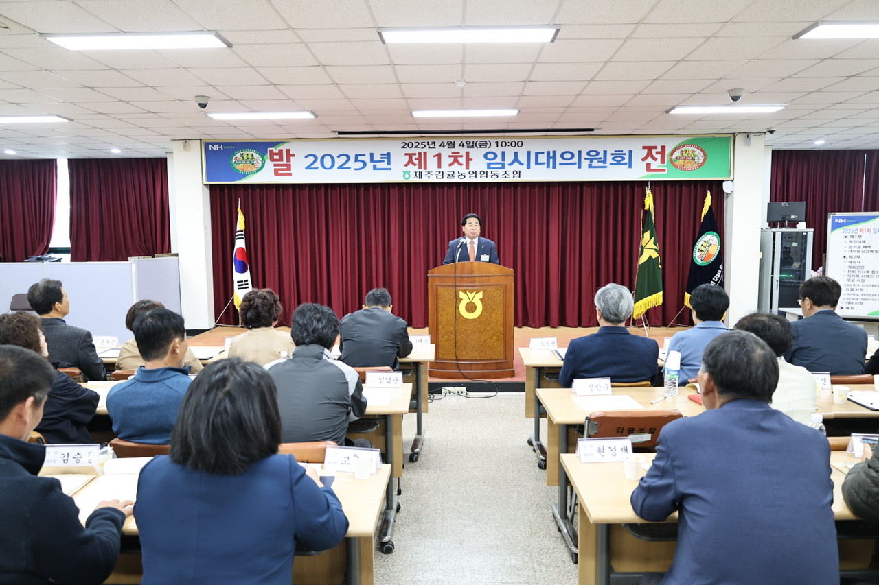 제주감귤농협(조합장 송창구)은 지난 4일 제주감귤농협 본점 대회의실에서 대의원 및 임직원이 참석한 가운데 2025년 제1차 임시대의원회를 개최했다.