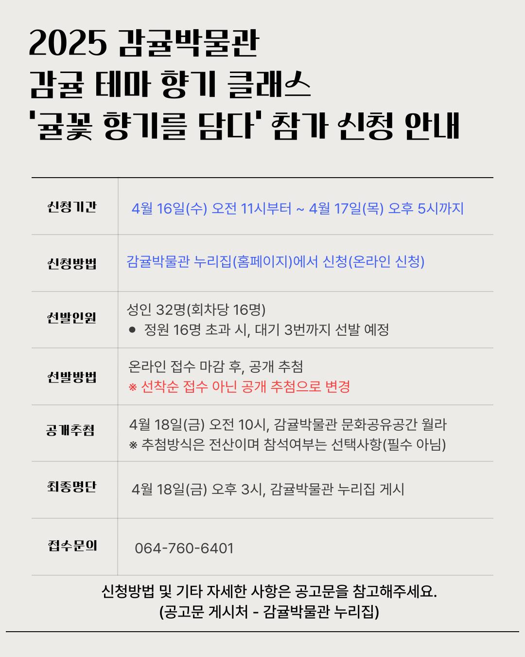 이번 체험은 성인을 대상으로 16명씩 총 2회차로 운영되며 참가비는 무료다. 참가 희망자는 오는 16일 오전 11시부터 17일 오후 5시까지 감귤박물관 누리집에서 온라인으로 신청할 수 있다.
